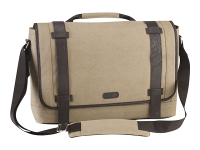 Sacoche contemporaine en toile de coton pour ordinateur portable avec simili cuir; parfait pour le travail, comme en week-end. Élégante sacoche en toile pour ordinateur portable avec intérieur ergonomique à rayures et beaucoup d'espace pour les accessoires et les affaires personnelles. Une poche en néoprène matelassée avec sangle en simili cuir maintient et protège votre ordinateur portable contre les coups et les rayures. Une poche a également été prévue pour votre tablette. La poignée et la bandoulière matelassées assurent un transport confortable.