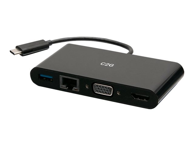 L'adaptateur multiport USB-C vers HDMI , VGA, USB-A et RJ45 se connecte aux ordinateurs portables équipés USB-C ou Thunderbolt 3. Il est parfait dans le cadre d'une solution de poste de travail, notamment pour les représentants commerciaux sédentaires pour qui la connectivité est essentielle, qu'ils soient au bureau ou à la maison.
