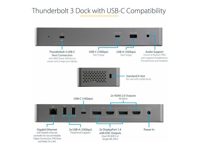 | Interfaces | 1 x USB-C 3.2 de 2e génération/Thunderbolt 3 avec alimentation électrique de 100 W (96 W soutenu) - 24 pin USB-C 2 x affichage / vidéo - DisplayPort - DisplayPort 20 broches 2 x affichage / vidéo - HDMI - HDMI de 19 broches de type A 1 x audio - casque/microphone - mini-phone stereo 3.5 mm 1 x réseau - 10Base-T/100Base-TX/1000Base-T - RJ-45 1 x USB 3.2 Gen 2 avec charge rapide - USB 9 broches type A 2 x USB 3.2 Gen 1 - USB 9 broches type A 1 x USB-C 3.2 de 2e génération avec chargement rapide - 24 pin USB-C 1 x USB-C 3.2 Gen 2 - 24 pin USB-C |