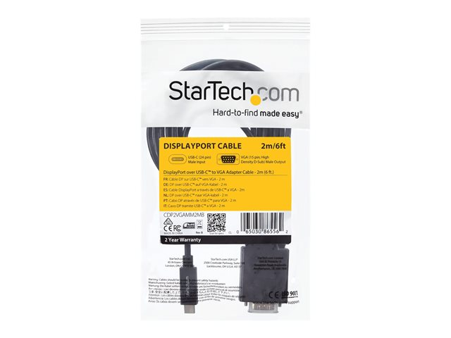 StarTech.com 6ft (2m) USB C to VGA Cable, 1920x1200/1080p USB Type C to VGA Video Active Adapter Cable, Thunderbolt 3 Compatible, Laptop to VGA Monitor/Projector, DP Alt Mode HBR2 Cable - 2m USB-C Video Cable (CDP2VGAMM2MB) - Câble vidéo / USB - 24 pin USB-C (M) pour HD-15 (VGA) (M) - 2 m - support 1920 x 1200 (WUXGA) - noir - pour P/N: TB4CDOCK