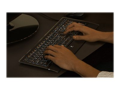 Un clavier ultraplat élégant doté de touches rétroéclairées et d'un repose-poignets doux au toucher pour une saisie confortable, même dans l'obscurité.