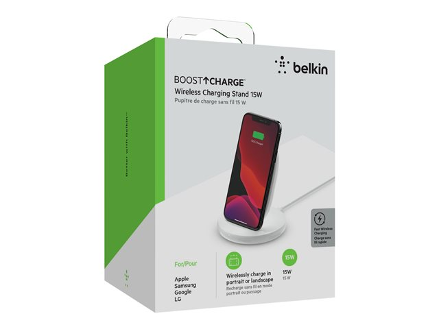 Belkin BOOST CHARGE - Plot de charge sans fil + adaptateur secteur - 15 Watt - blanc - pour Apple iPhone 11, 11 Pro, 11 Pro Max, 8, 8 Plus, X, XR, XS, XS Max; Samsung Galaxy Note10, Note10+, S10, S10+, S10e