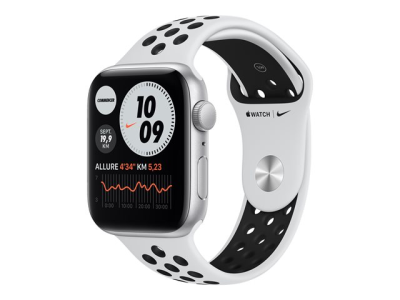 Apple Watch Nike SE (GPS) - 44 mm - aluminium argenté - montre intelligente avec bracelet sport Nike - fluoroélastomère - platine pure/noir - taille du bracelet : S/M/L - 32 Go - Wi-Fi, Bluetooth - 36.2 g